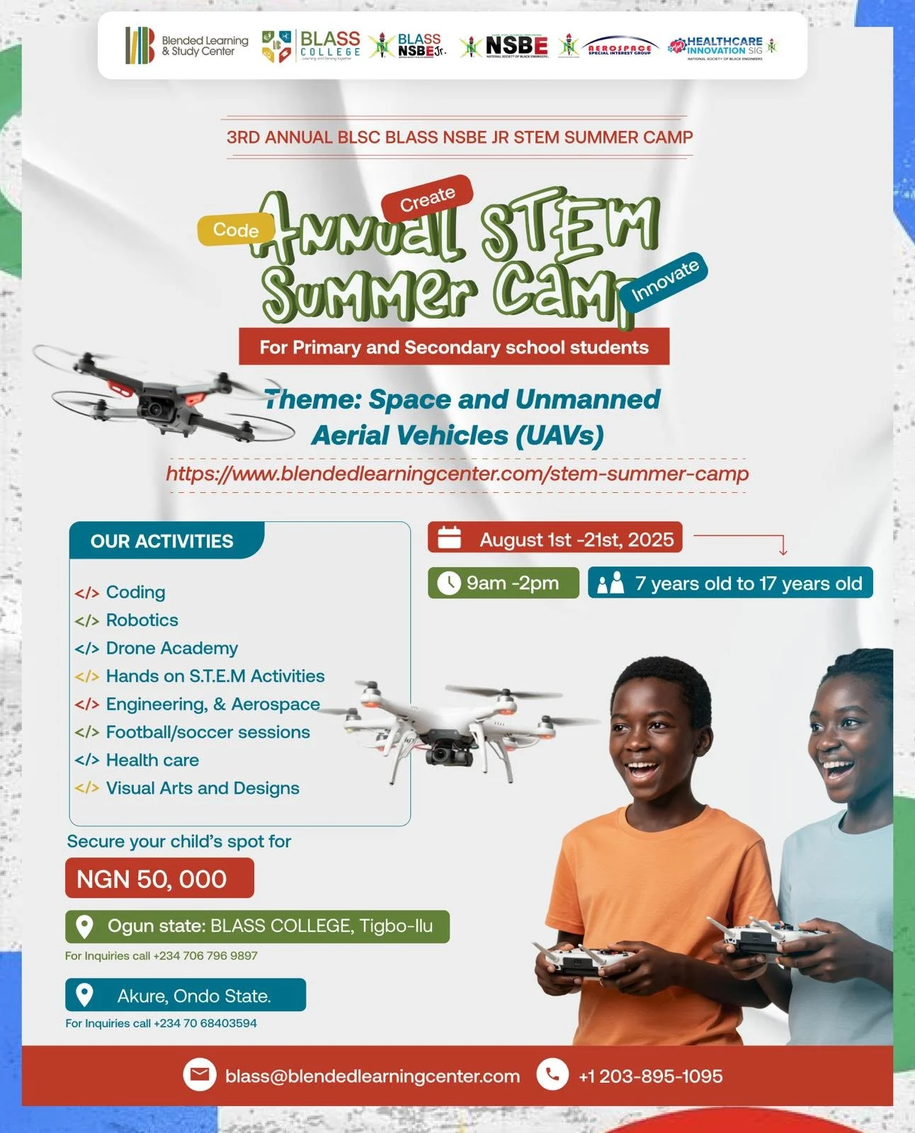 We are excited to announce that Blended Learning and Study Center (BLSC) BLASS NSBE Jr. Chapter will hold its third annual STEM Summer Camp in collaboration with NSBE Aerospace SIG and NSBE Healthcare Innovation SIG from August 1st - August 21st, 2025 at BLASS COLLEGE, TIGBO-ILU, OGUN STATE, NIGERIA. The STEM Camp will also be held concurrently at BLASS COLLEGE, AKURE, Ondo state.